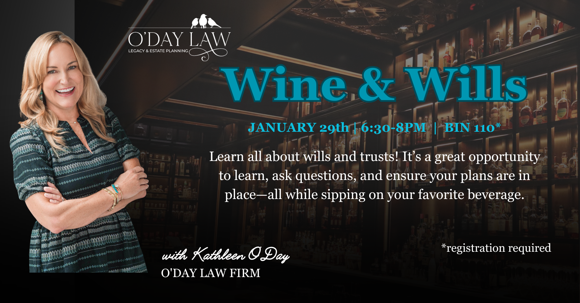 Come enjoy a complimentary beverage and hors d’oeuvres while learning about estate planning essentials. It’s a great opportunity to learn, ask questions, and ensure your plans are in place—all while sipping on your favorite beverage.